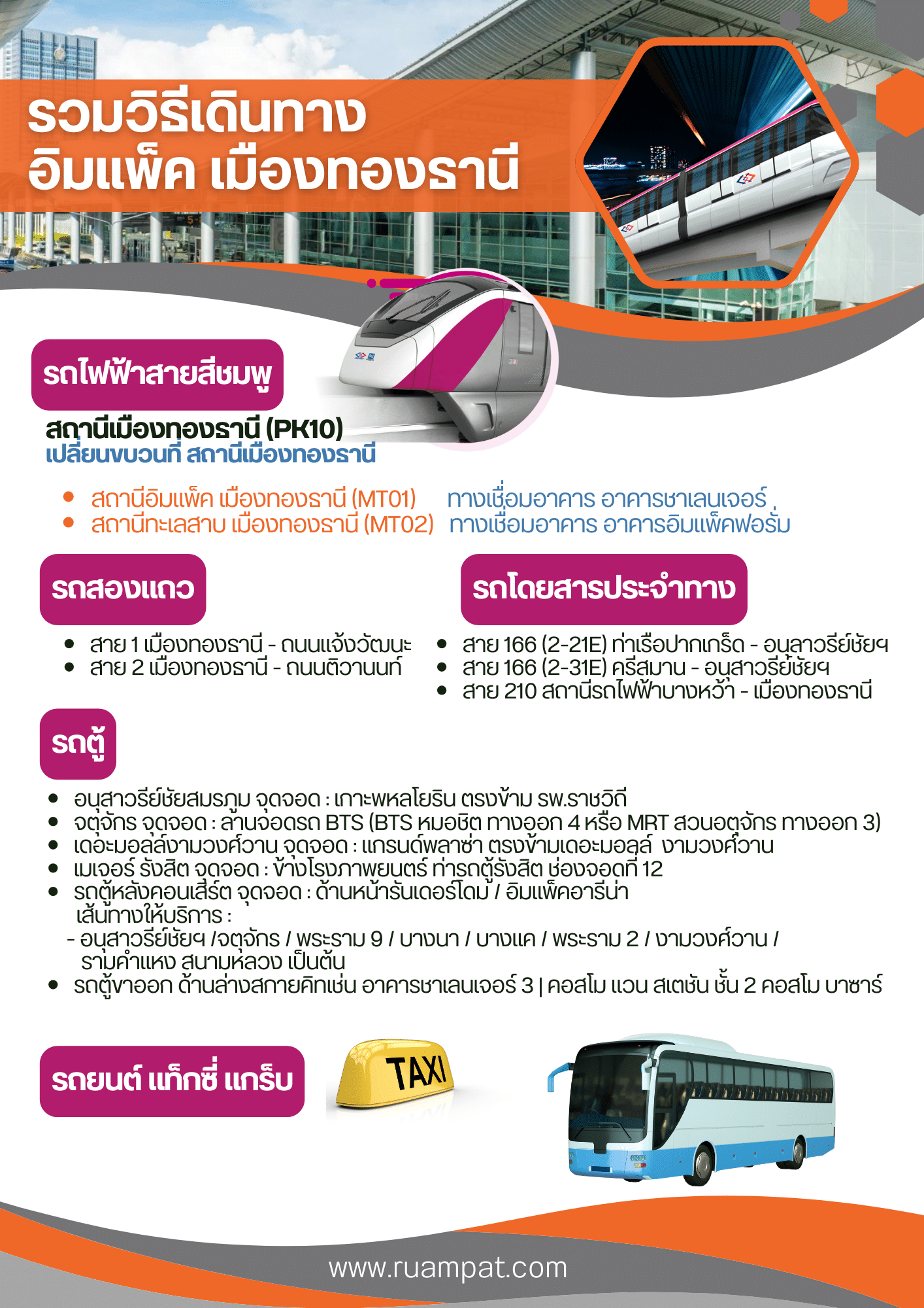 ปัจจุบันสามารถเดินทางมายัง IMPACT เมืองทองธานี ได้สะดวกขึ้นด้วย Bangkok MRT Pink Line สถานีที่ใกล้กับสถานที่จัดงาน ได้แก่